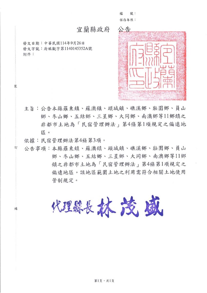 「宜蘭縣11個鄉鎮屬民宿管理辦法之偏遠地區」修正公告