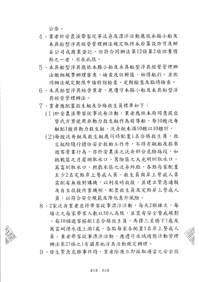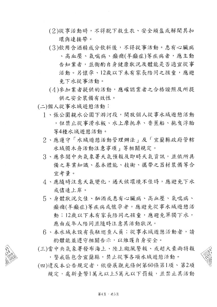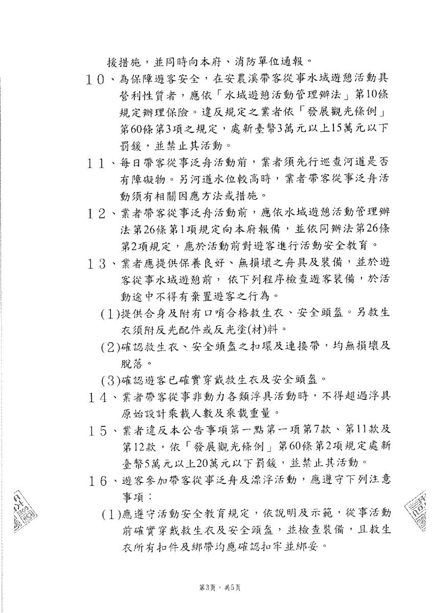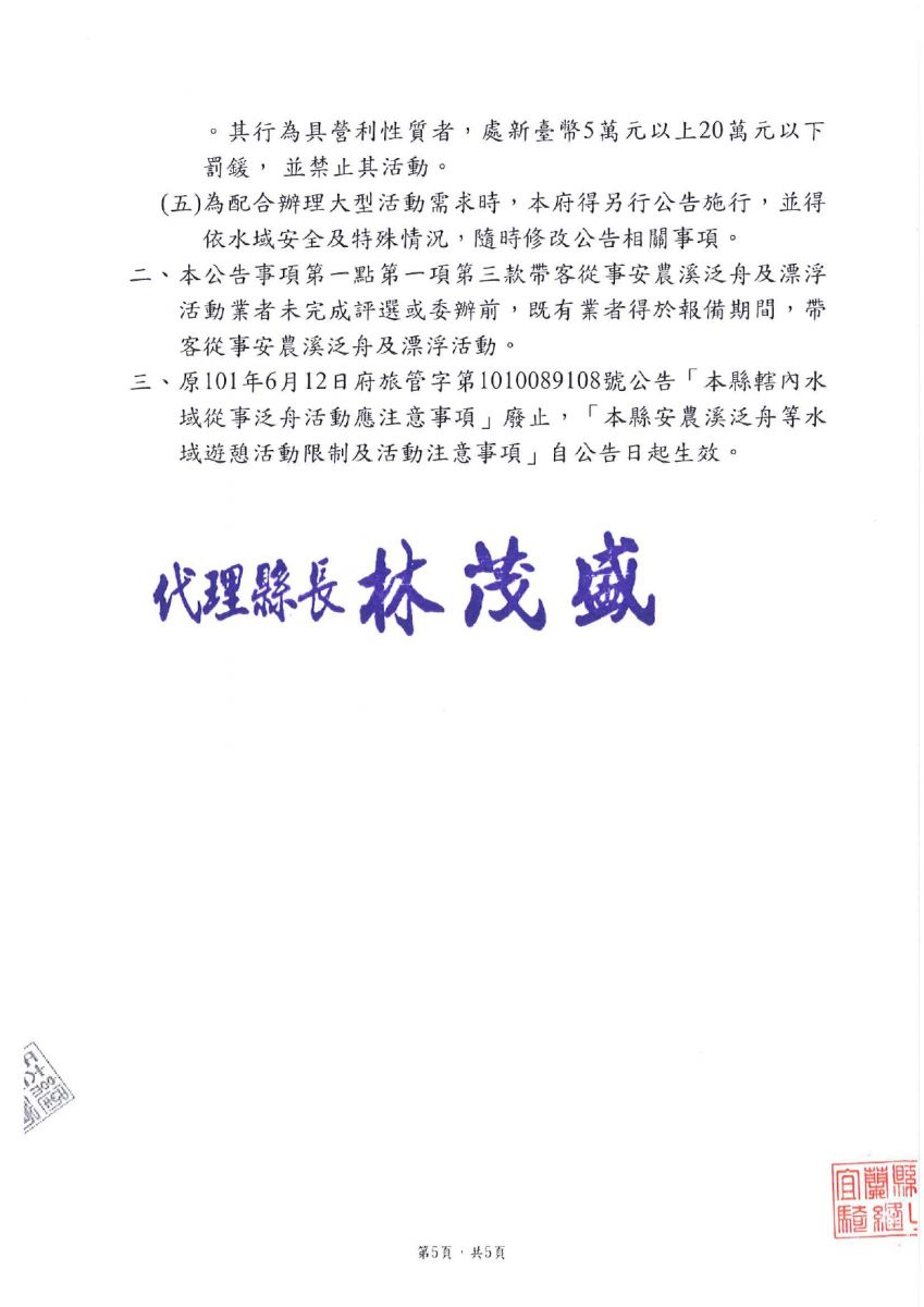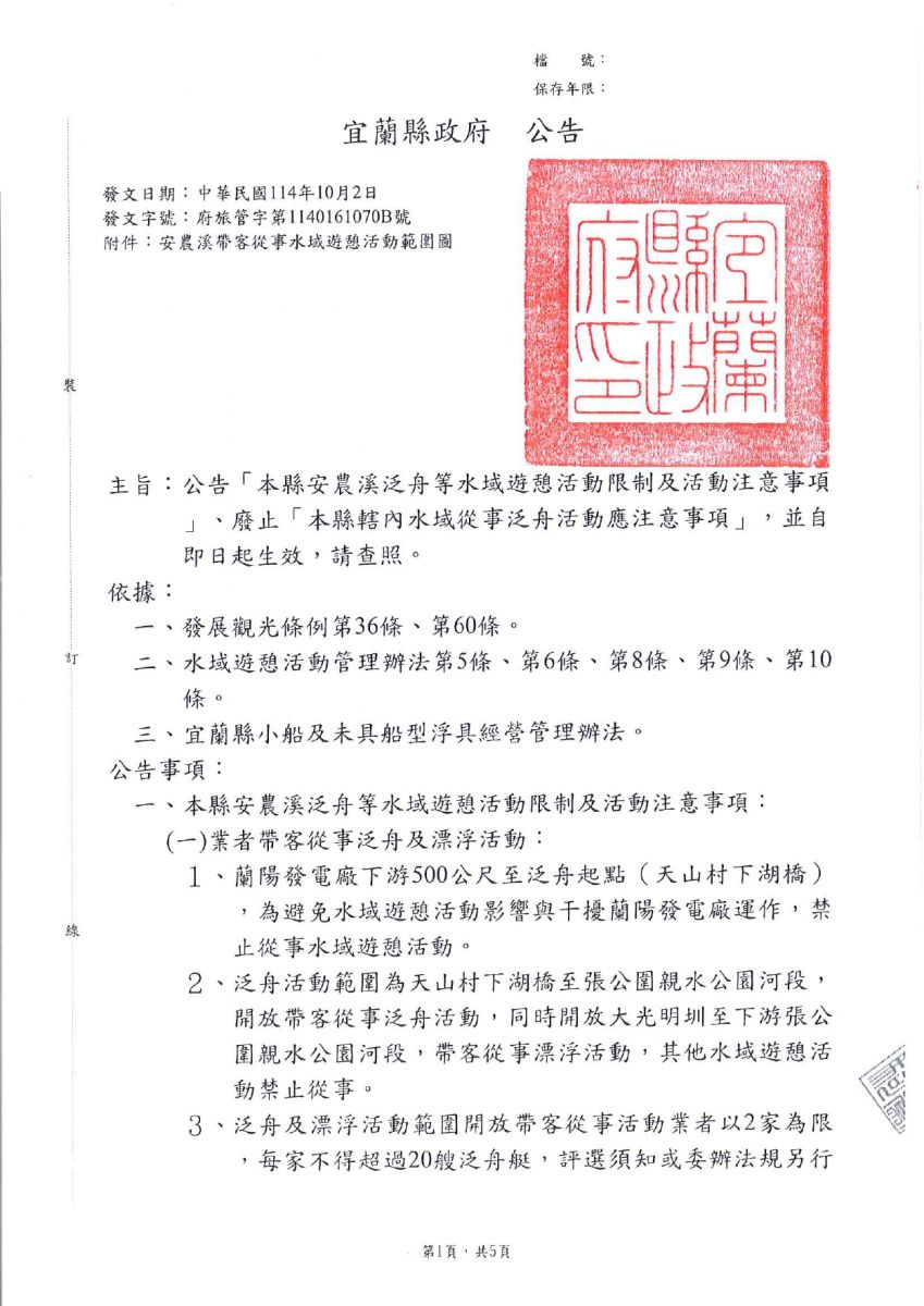 「宜蘭縣安農溪泛舟等水域遊憩活動限制及活動注意事項」、廢止「本縣轄內水域從事泛舟活動應注意事項」,並自即日起生效