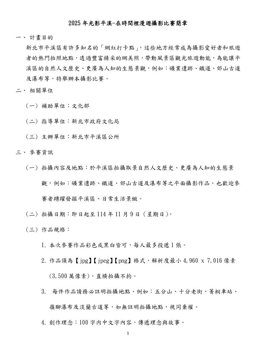 本次攝影比賽以「在時間裡漫遊」為主題,以平溪區之礦業遺跡、鐵道、古道及日常景緻為拍攝題材,透過影像作品呈現地方景觀亮點,徵件期間自即日起至114年11月9日(星期日)止。