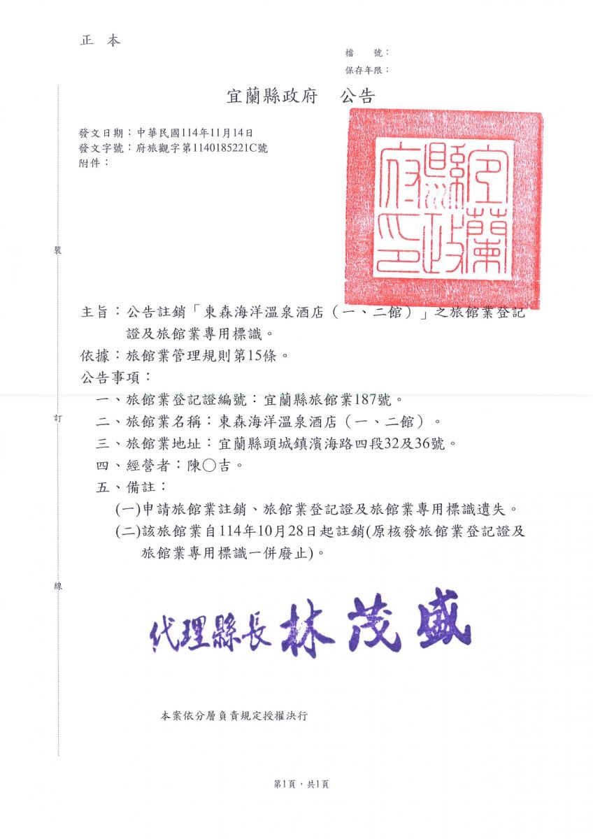 「東森海洋溫泉酒店(一、二館)」旅館業註銷公告