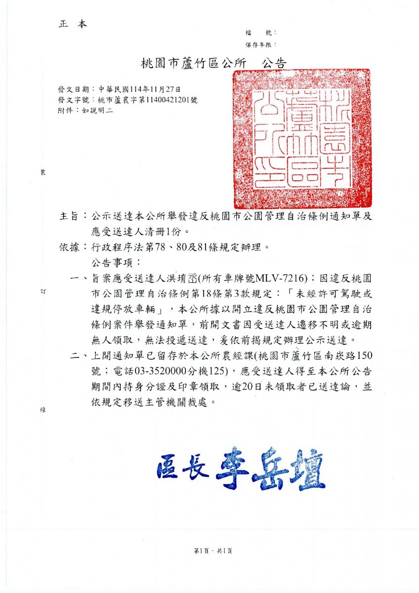 洪堉㞼領取處理違反桃園市公園管理自治條例案件舉發單公示送達公告
