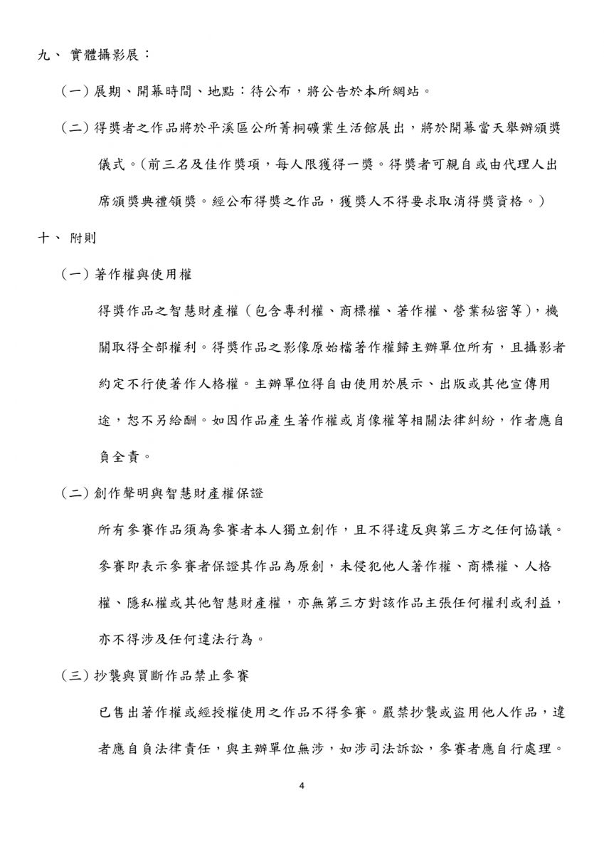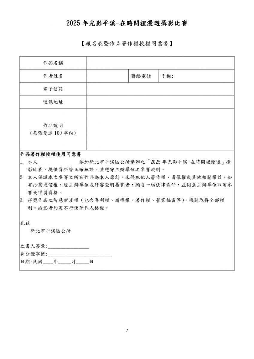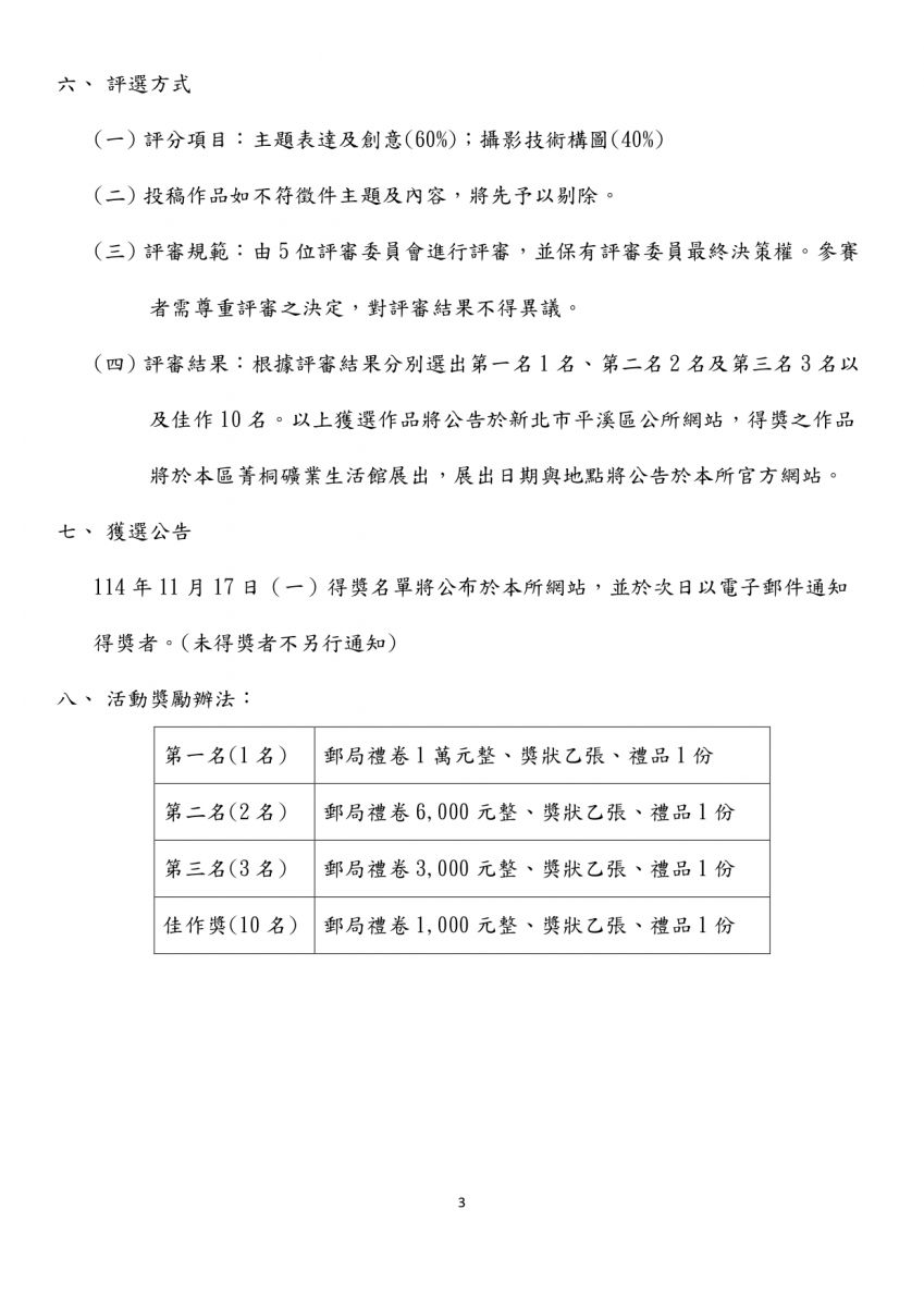 本次攝影比賽以「在時間裡漫遊」為主題,以平溪區之礦業遺跡、鐵道、古道及日常景緻為拍攝題材,透過影像作品呈現地方景觀亮點,徵件期間自即日起至114年11月9日(星期日)止。