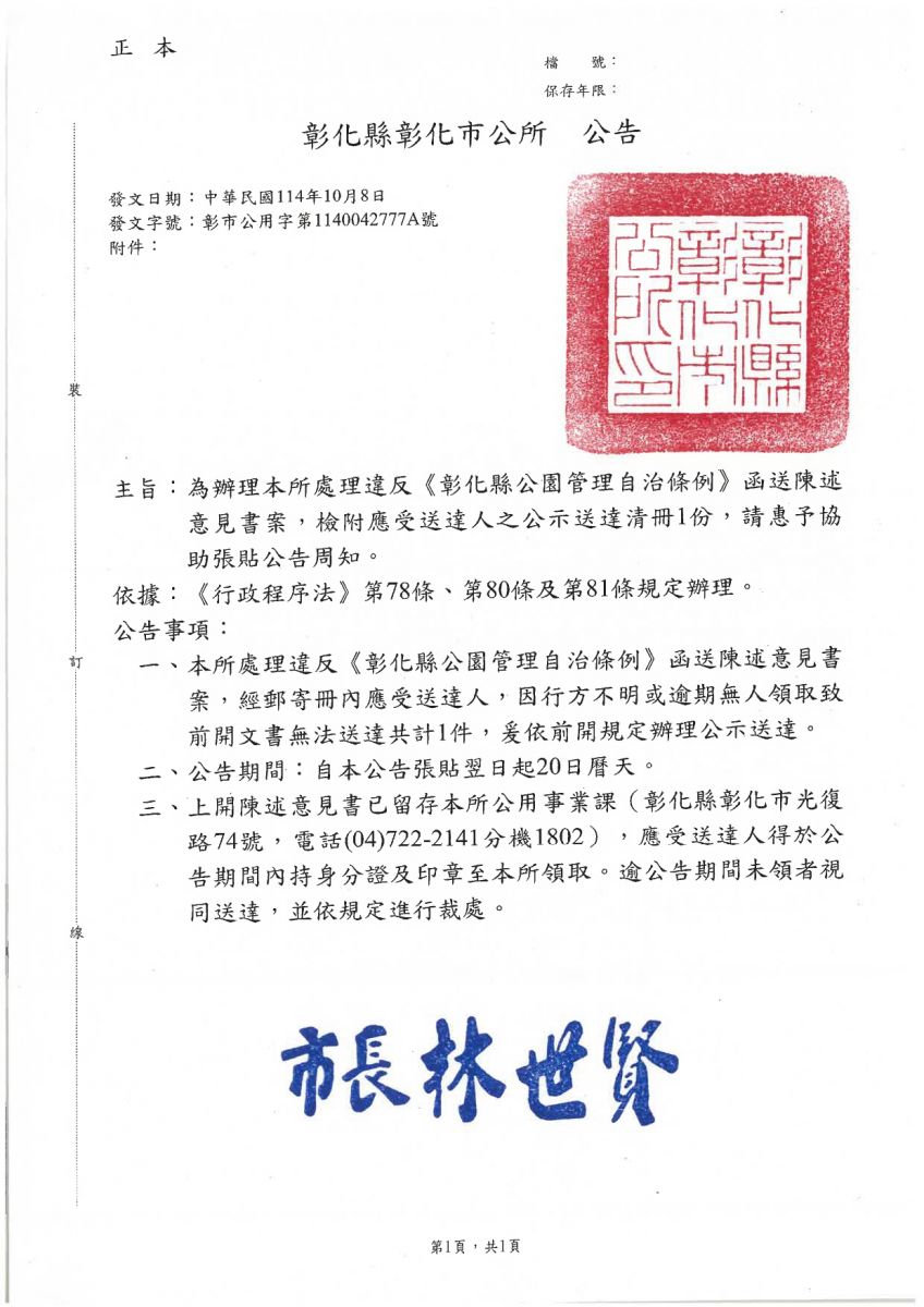 違反《彰化縣公園管理自治條例》函送陳述意見書案公告