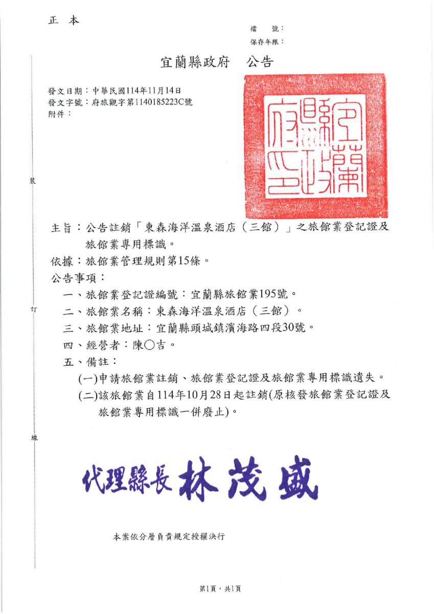 「東森海洋溫泉酒店(三館)」旅館業註銷公告